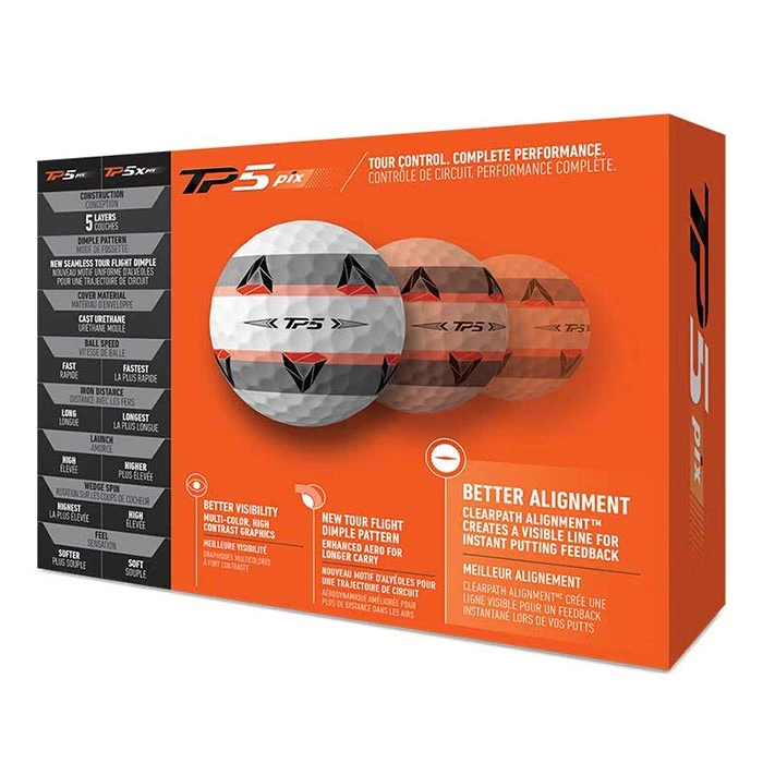 | TP5 pix | 5 LAYERS | NEW SEAMLESS TOUR FLIGHT DIMPLE | SOFT-TOUGH CAST URETHANE | FASTER | LONG | HIGH | HIGHEST | SOFTER |